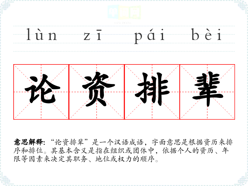 “论资排辈”是一个汉语成语,字面意思是根据资历来排序和排位。其基本含义是指在组织或团体中,依据个人的资历、年限等因素来决定其职务、地位或权力的顺序。