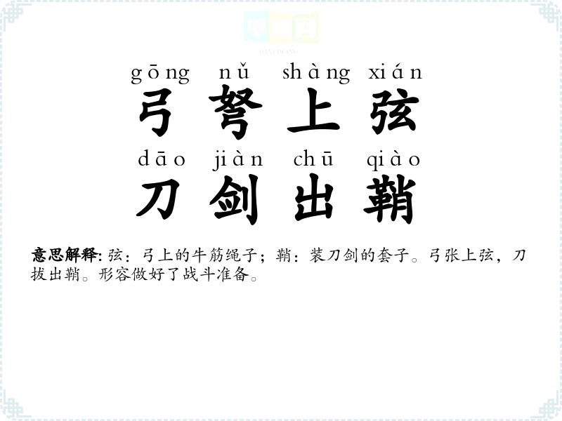 | 弓弩上弦,刀剑出鞘 | 弦:弓上的牛筋绳子;鞘:装刀剑的套子。弓张上弦,刀拔出鞘。形容做好了战斗准备。 |