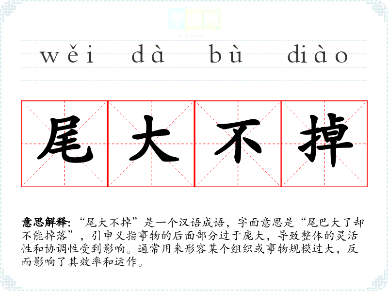 “尾大不掉”是一个汉语成语,字面意思是“尾巴大了却不能掉落”,引申义指事物的后面部分过于庞大,导致整体的灵活性和协调性受到影响。通常用来形容某个组织或事物规模过大,反而影响了其效率和运作。