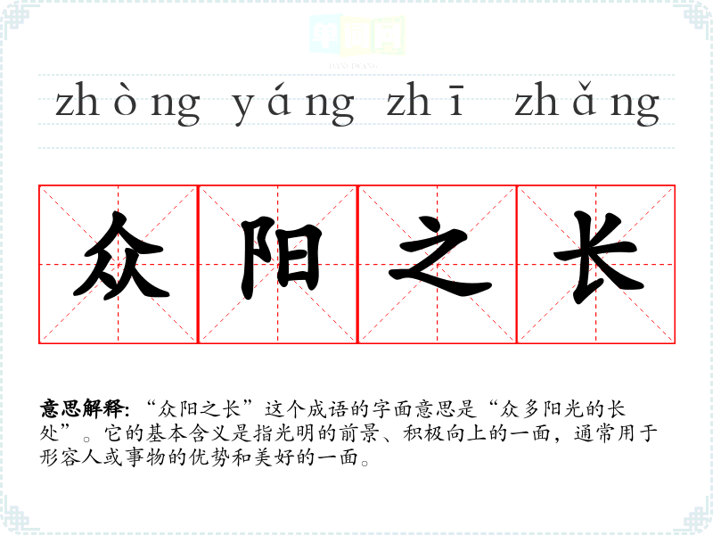 “众阳之长”这个成语的字面意思是“众多阳光的长处”。它的基本含义是指光明的前景、积极向上的一面,通常用于形容人或事物的优势和美好的一面。
