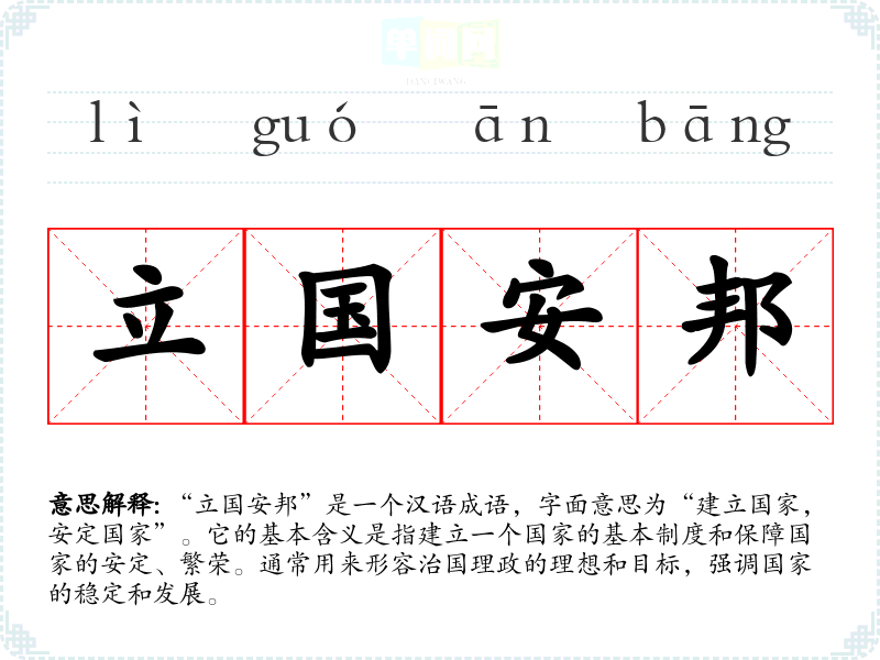 “立国安邦”是一个汉语成语,字面意思为“建立国家,安定国家”。它的基本含义是指建立一个国家的基本制度和保障国家的安定、繁荣。通常用来形容治国理政的理想和目标,强调国家的稳定和发展。