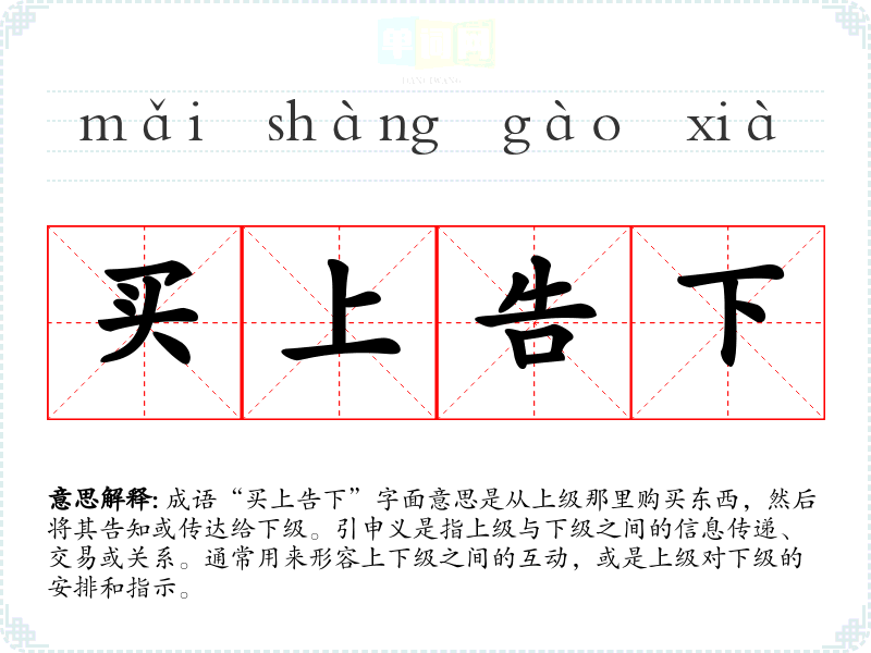 “买上告下”并没有明确的历史典故或文学出处,但它反映了**古代社会中上下级关系的特征。在封建社会中,上级往往掌握资源与信息,而下级则负责执行和传达。因此,这个成语可以视为对古代官僚体系和社会结构的一种描述。