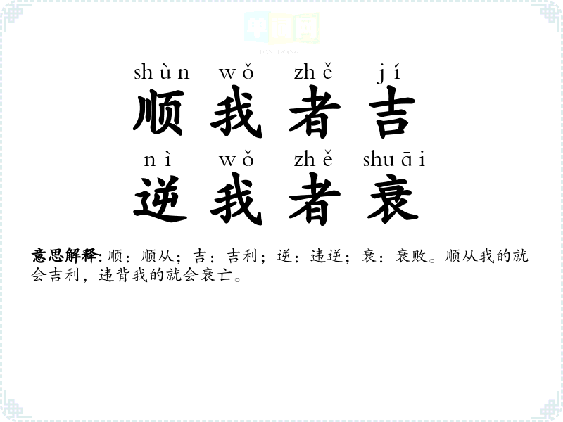 | 顺之者昌,逆之者亡 | 顺:顺从;昌:昌盛;逆:违背;亡:灭亡。顺从他的就可以存在和发展,违抗他的就叫你灭亡。形容剥削阶级的独裁统治。 |