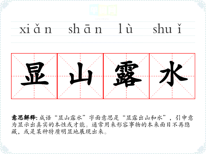 “显山露水”出自《红楼梦》第五十七回:“只见那山上有个小水,显山露水,也有些样子。” 这个成语反映了自然界中山水的相辅相成,以及在特定环境下的真实显现。它强调了事物的本质和真相,不可掩饰。