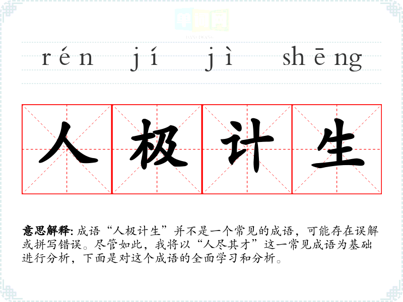 成语“人极计生”并不是一个常见的成语,可能存在误解或拼写错误。尽管如此,我将以“人尽其才”这一常见成语为基础进行分析,下面是对这个成语的全面学*和分析。