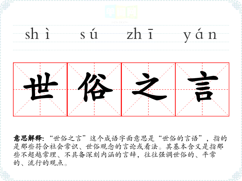 “世俗之言”这个成语字面意思是“世俗的言语”,指的是那些符合社会常识、世俗观念的言论或看法。其基本含义是指那些不超越常理、不具备深刻内涵的言辞,往往强调世俗的、平常的、流行的观点。