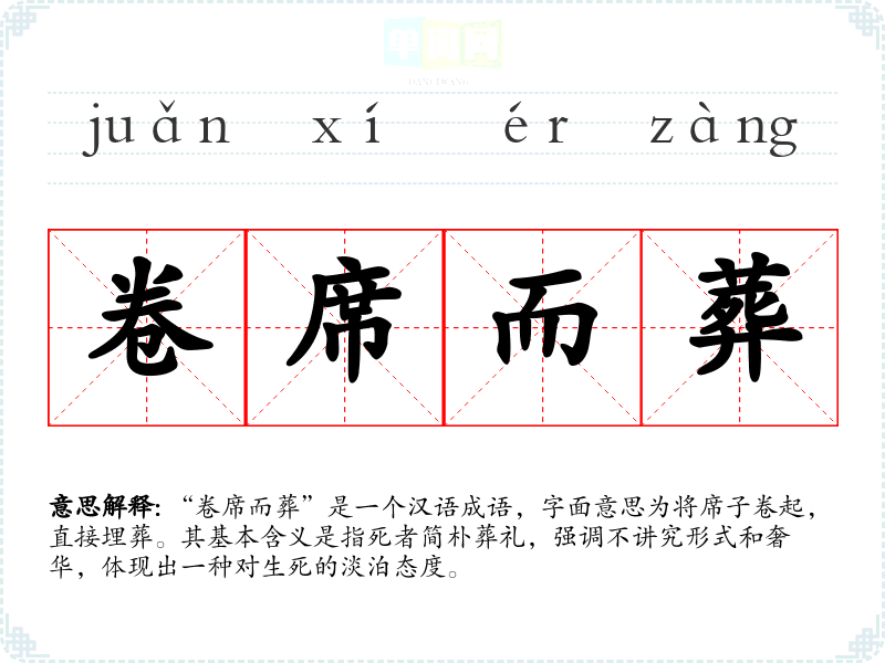“卷席而葬”是一个汉语成语,字面意思为将席子卷起,直接埋葬。其基本含义是指死者简朴葬礼,强调不讲究形式和奢华,体现出一种对生死的淡泊态度。