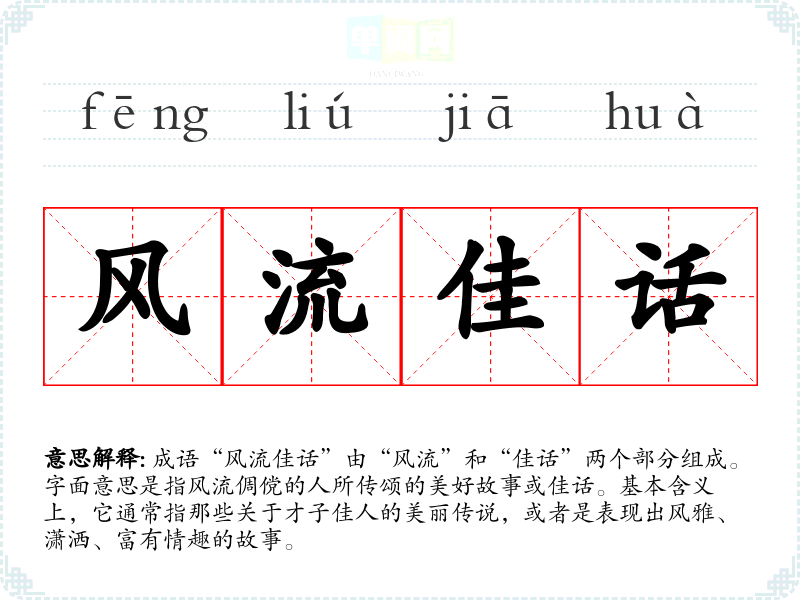 成语“风流佳话”由“风流”和“佳话”两个部分组成。字面意思是指风流倜傥的人所传颂的美好故事或佳话。基本含义上,它通常指那些关于才子佳人的美丽传说,或者是表现出风雅、潇洒、富有情趣的故事。