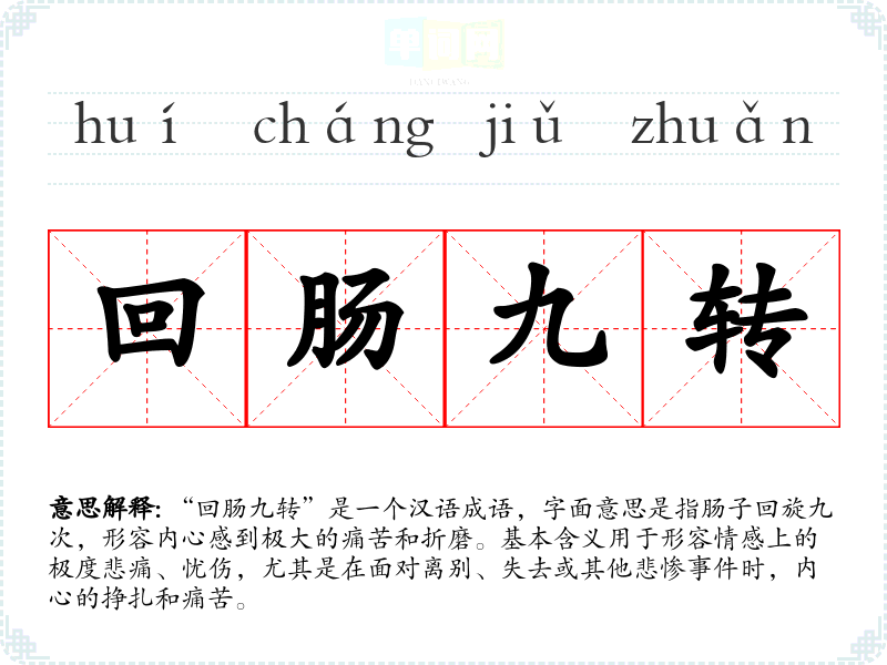 | 九回肠断 | 形容痛苦、忧虑、愁闷已经到了极点。同“九回肠”。 |