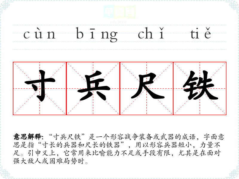 “寸兵尺铁”是一个形容战争装备或武器的成语,字面意思是指“寸长的兵器和尺长的铁器”,用以形容兵器短小,力量不足。引申义上,它常用来比喻能力不足或手段有限,尤其是在面对强大敌人或困难局势时。