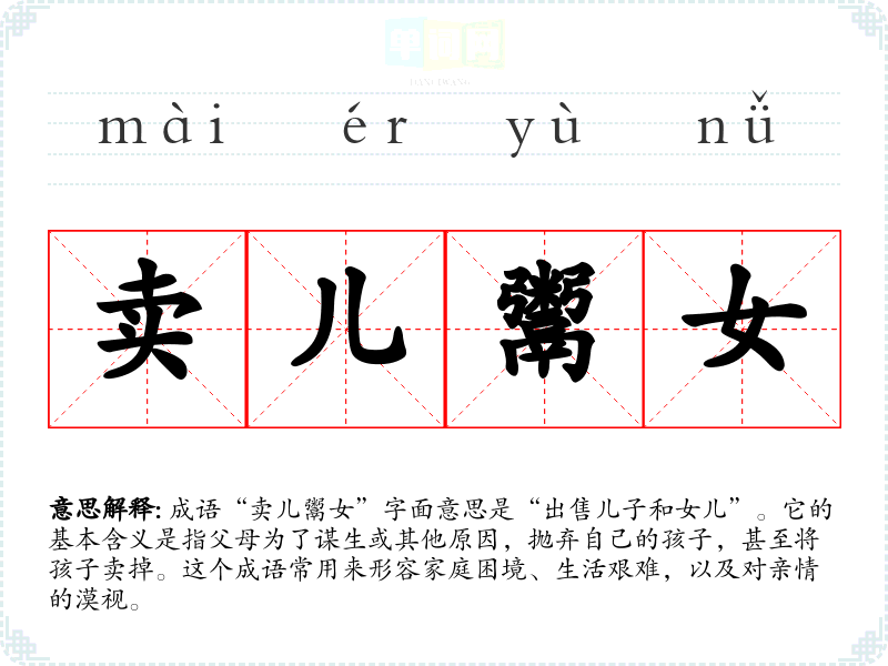 成语“卖儿鬻女”字面意思是“出售儿子和女儿”。它的基本含义是指父母为了谋生或其他原因,抛弃自己的孩子,甚至将孩子卖掉。这个成语常用来形容家庭困境、生活艰难,以及对亲情的漠视。