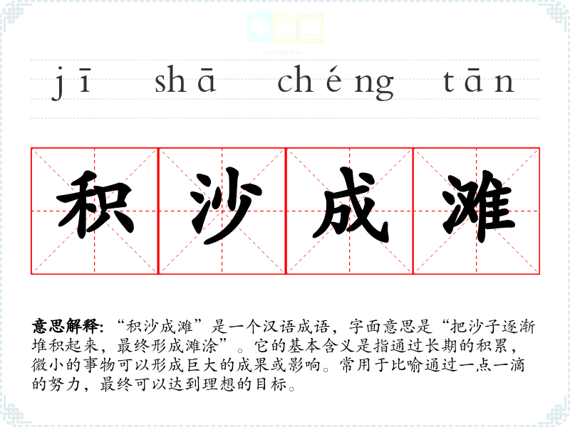 “积沙成滩”是一个汉语成语,字面意思是“把沙子逐渐堆积起来,最终形成滩涂”。它的基本含义是指通过长期的积累,微小的事物可以形成巨大的成果或影响。常用于比喻通过一点一滴的努力,最终可以达到理想的目标。