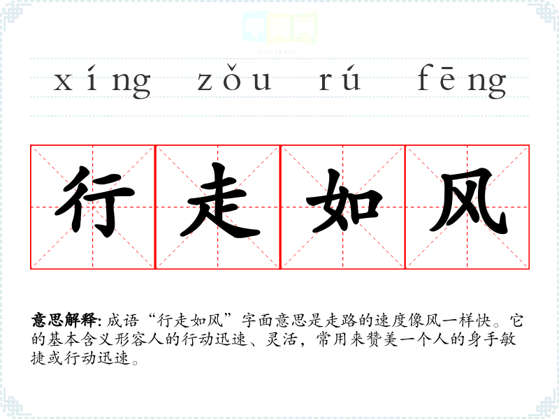 成语“行走如风”字面意思是走路的速度像风一样快。它的基本含义形容人的行动迅速、灵活,常用来赞美一个人的身手敏捷或行动迅速。