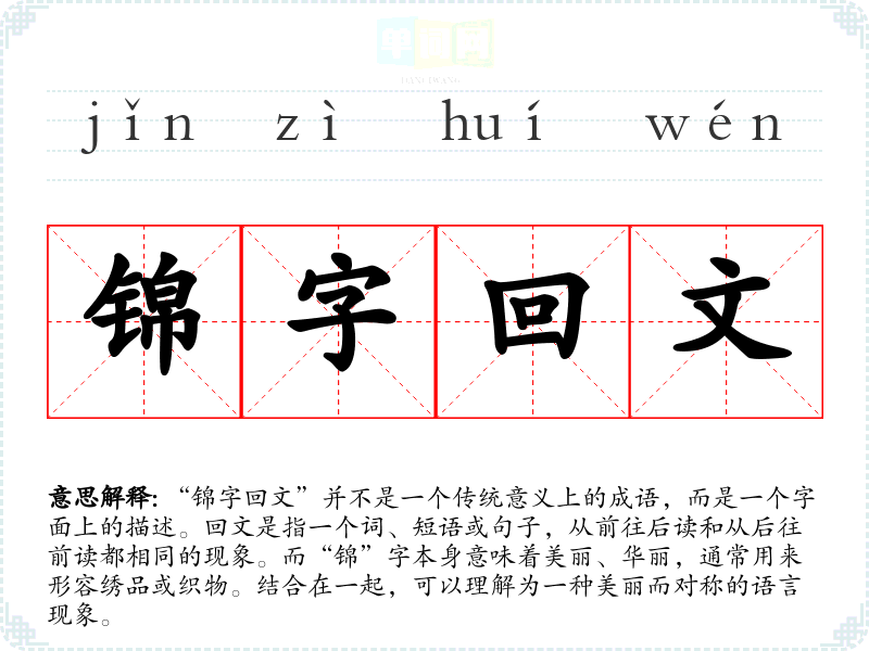 “锦字回文”并不是一个传统意义上的成语,而是一个字面上的描述。回文是指一个词、短语或句子,从前往后读和从后往前读都相同的现象。而“锦”字本身意味着美丽、华丽,通常用来形容绣品或织物。结合在一起,可以理解为一种美丽而对称的语言现象。