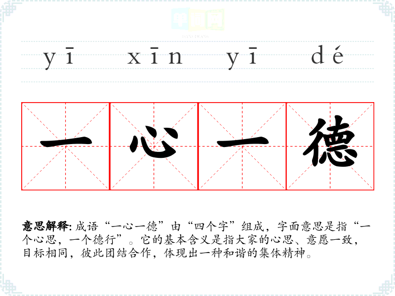 成语“一心一德”由“四个字”组成,字面意思是指“一个心思,一个德行”。它的基本含义是指大家的心思、意愿一致,目标相同,彼此团结合作,体现出一种和谐的集体精神。