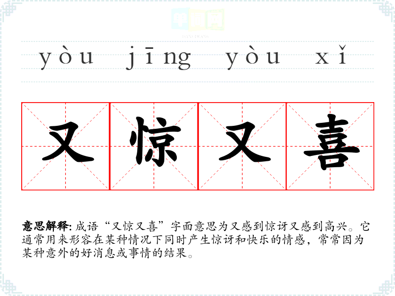 成语“又惊又喜”字面意思为又感到惊讶又感到高兴。它通常用来形容在某种情况下同时产生惊讶和快乐的情感,常常因为某种意外的好消息或事情的结果。