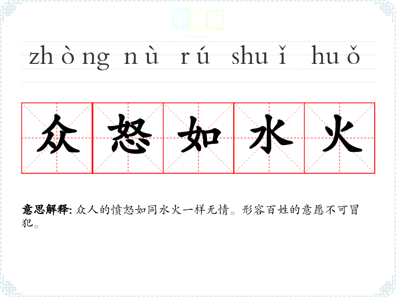 | 众怒如水火 | 众人的愤怒如同水火一样无情。形容百姓的意愿不可冒犯。 |