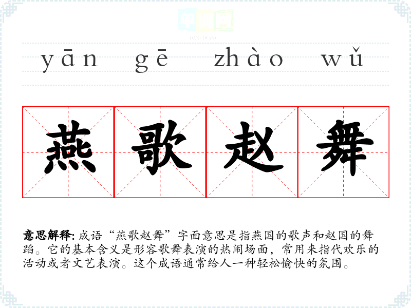 成语“燕歌赵舞”字面意思是指燕国的歌声和赵国的舞蹈。它的基本含义是形容歌舞表演的热闹场面,常用来指代欢乐的活动或者文艺表演。这个成语通常给人一种轻松愉快的氛围。