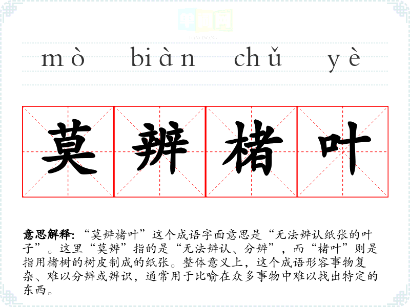 “莫辨楮叶”这个成语字面意思是“无法辨认纸张的叶子”。这里“莫辨”指的是“无法辨认、分辨”,而“楮叶”则是指用楮树的树皮制成的纸张。整体意义上,这个成语形容事物复杂、难以分辨或辨识,通常用于比喻在众多事物中难以找出特定的东西。