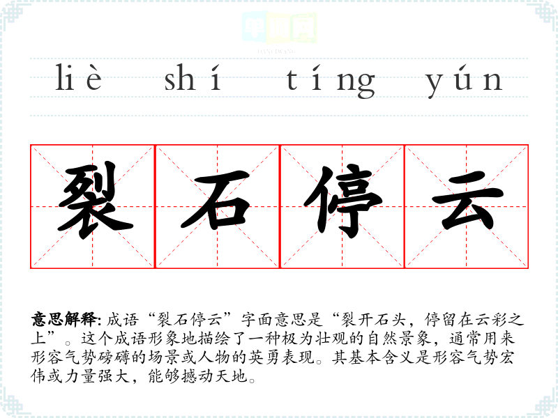 成语“裂石停云”字面意思是“裂开石头,停留在云彩之上”。这个成语形象地描绘了一种极为壮观的自然景象,通常用来形容气势磅礴的场景或人物的英勇表现。其基本含义是形容气势宏伟或力量强大,能够撼动天地。