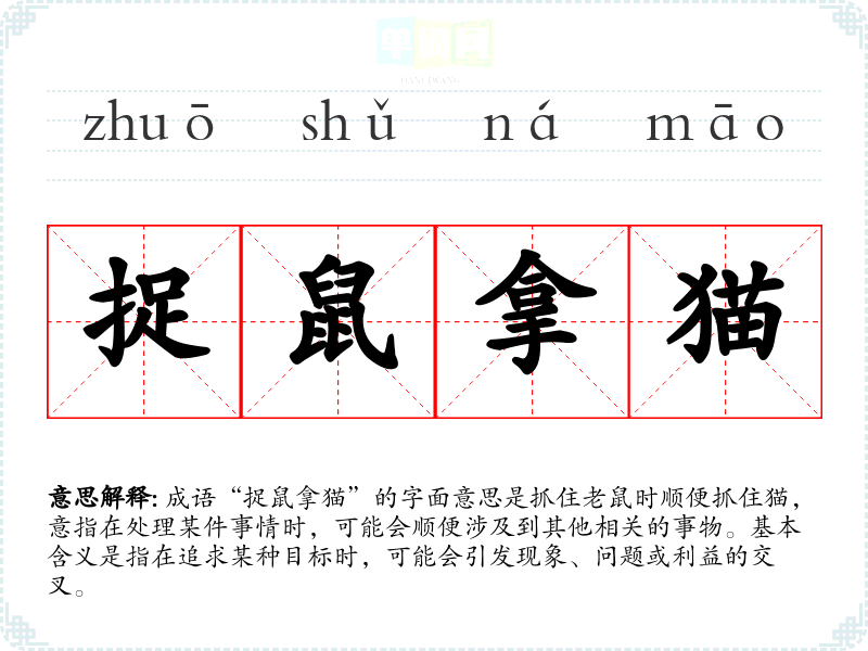 成语“捉鼠拿猫”的字面意思是抓住老鼠时顺便抓住猫,意指在处理某件事情时,可能会顺便涉及到其他相关的事物。基本含义是指在追求某种目标时,可能会引发现象、问题或利益的交叉。