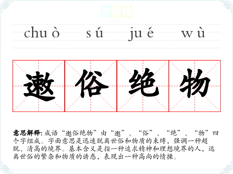 成语“遫俗绝物”由“遫”、“俗”、“绝”、“物”四个字组成。字面意思是迅速脱离世俗和物质的束缚,强调一种超脱、清高的境界。基本含义是指一种追求精神和理想境界的人,远离世俗的繁杂和物质的诱惑,表现出一种高尚的情操。