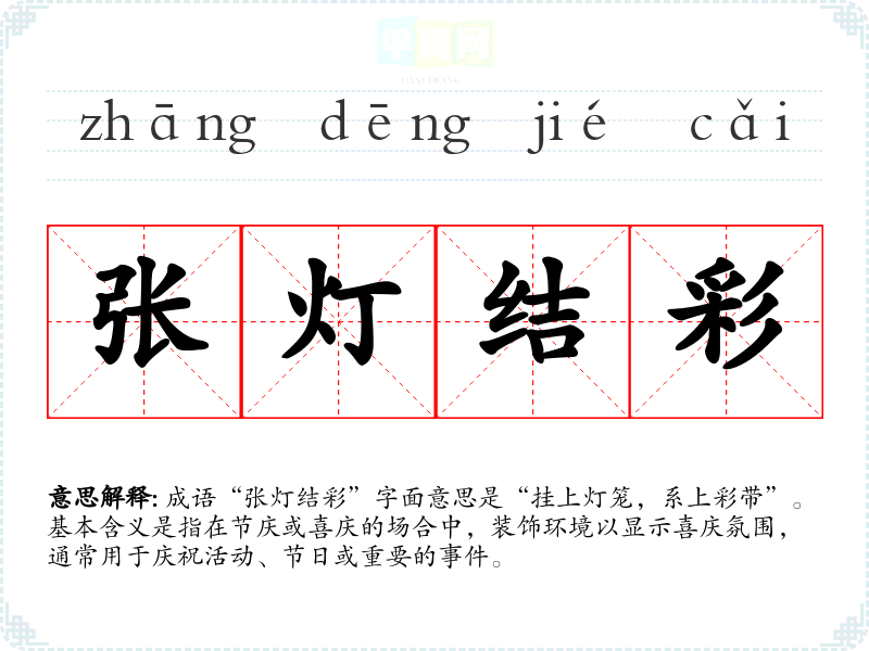 成语“张灯结彩”字面意思是“挂上灯笼,系上彩带”。基本含义是指在节庆或喜庆的场合中,装饰环境以显示喜庆氛围,通常用于庆祝活动、节日或重要的**。