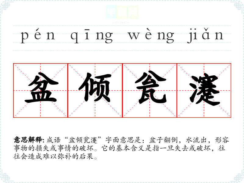 成语“盆倾瓮瀽”字面意思是:盆子翻倒,水流出,形容事物的损失或事情的破坏。它的基本含义是指一旦失去或破坏,往往会造成难以弥补的后果。