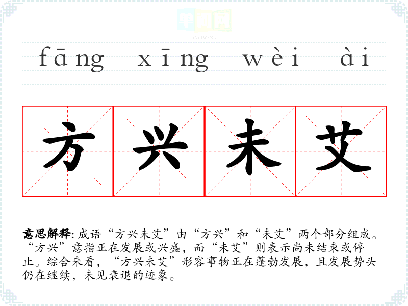 成语“方兴未艾”由“方兴”和“未艾”两个部分组成。“方兴”意指正在发展或兴盛,而“未艾”则表示尚未结束或停止。综合来看,“方兴未艾”形容事物正在蓬勃发展,且发展势头仍在继续,未见衰退的迹象。