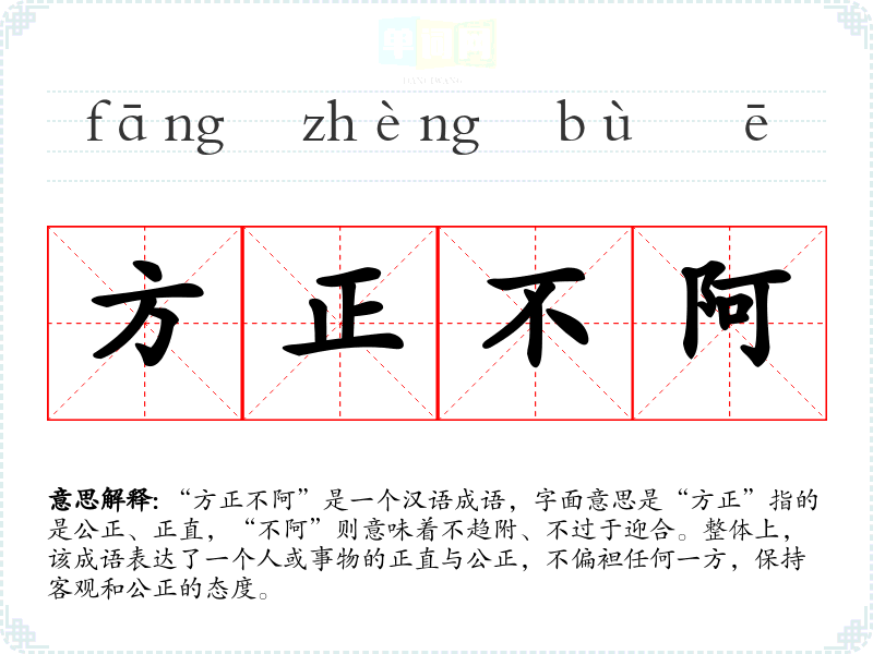 “方正不阿”是一个汉语成语,字面意思是“方正”指的是公正、正直,“不阿”则意味着不趋附、不过于迎合。整体上,该成语表达了一个人或事物的正直与公正,不偏袒任何一方,保持客观和公正的态度。