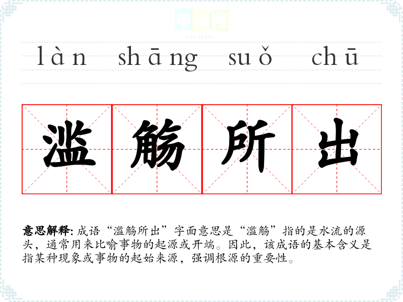 成语“滥觞所出”字面意思是“滥觞”指的是水流的源头,通常用来比喻事物的起源或开端。因此,该成语的基本含义是指某种现象或事物的起始来源,强调根源的重要性。