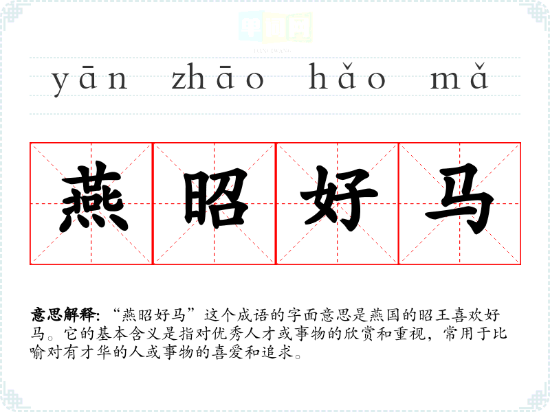 “燕昭好马”这个成语的字面意思是燕国的昭王喜欢好马。它的基本含义是指对优秀人才或事物的欣赏和重视,常用于比喻对有才华的人或事物的喜爱和追求。