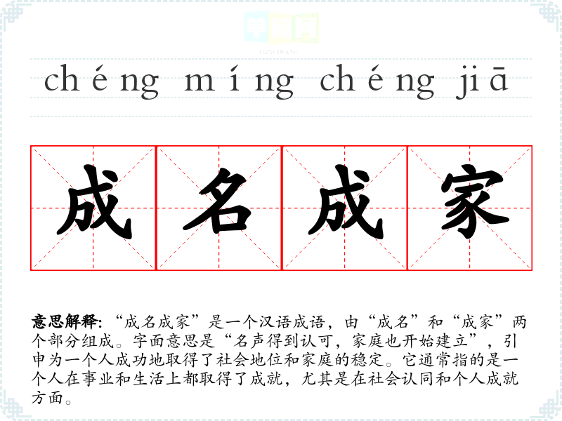 “成名成家”是一个汉语成语,由“成名”和“成家”两个部分组成。字面意思是“名声得到认可,家庭也开始建立”,引申为一个人成功地取得了社会地位和家庭的稳定。它通常指的是一个人在事业和生活上都取得了成就,尤其是在社会认同和个人成就方面。