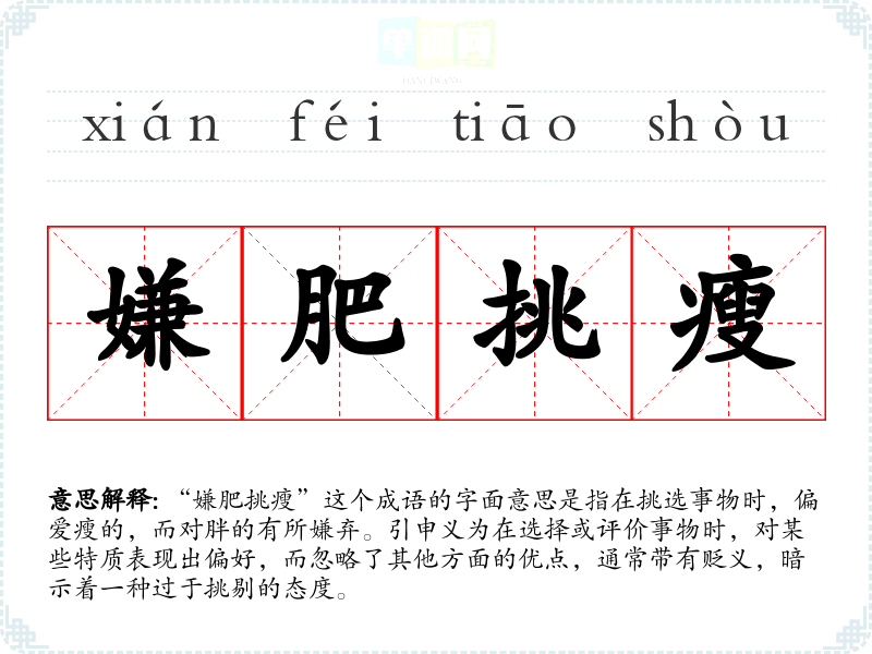 “嫌肥挑瘦”这个成语的字面意思是指在挑选事物时,偏爱瘦的,而对胖的有所嫌弃。引申义为在选择或评价事物时,对某些特质表现出偏好,而忽略了其他方面的优点,通常带有贬义,暗示着一种过于挑剔的态度。