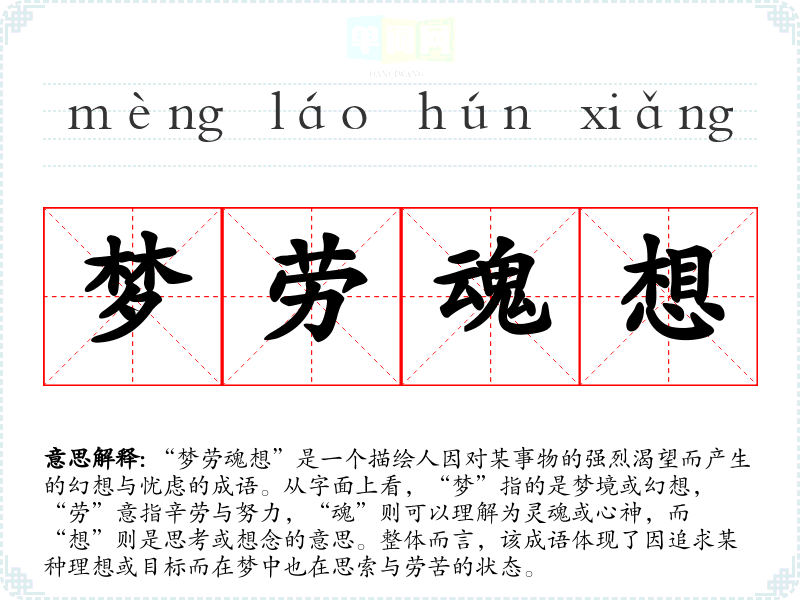 “梦劳魂想”是一个描绘人因对某事物的强烈渴望而产生的幻想与忧虑的成语。从字面上看,“梦”指的是梦境或幻想,“劳”意指辛劳与努力,“魂”则可以理解为灵魂或心神,而“想”则是思考或想念的意思。整体而言,该成语体现了因追求某种理想或目标而在梦中也在思索与劳苦的状态。