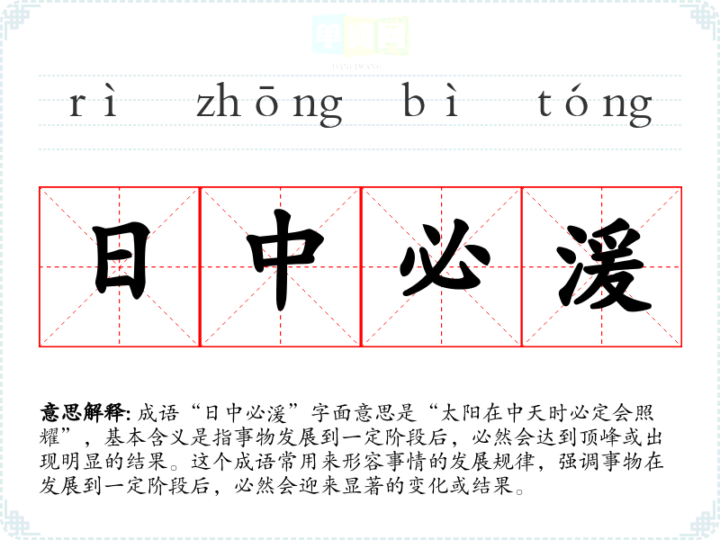 成语“日中必湲”字面意思是“太阳在中天时必定会照耀”,基本含义是指事物发展到一定阶段后,必然会达到顶峰或出现明显的结果。这个成语常用来形容事情的发展规律,强调事物在发展到一定阶段后,必然会迎来显著的变化或结果。