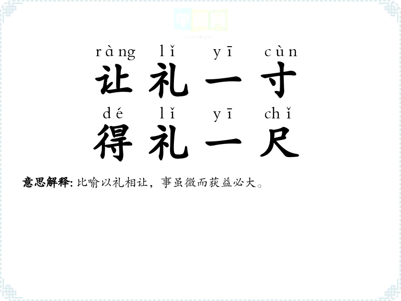 | 让礼一寸,得礼一尺 | 比喻以礼相让,事虽微而获益必大。 |