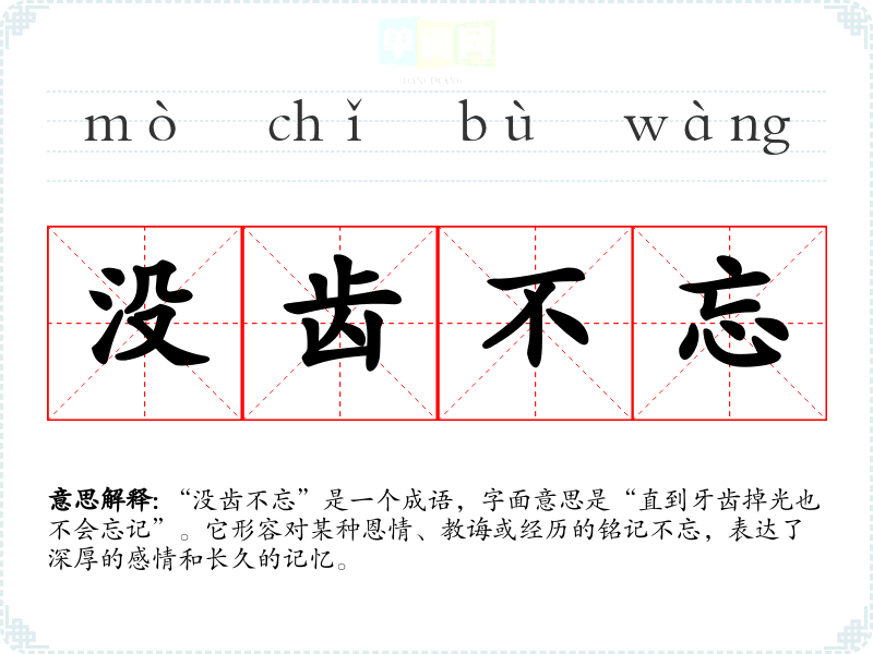 “没齿不忘”是一个成语,字面意思是“直到牙齿掉光也不会忘记”。它形容对某种恩情、教诲或经历的铭记不忘,表达了深厚的感情和长久的记忆。
