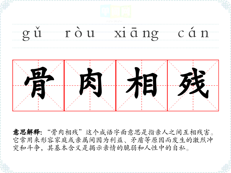 “骨肉相残”这个成语字面意思是指亲人之间互相残害。它常用来形容家庭或亲属间因为利益、矛盾等原因而发生的激烈冲突和斗争,其基本含义是揭示亲情的脆弱和人性中的自私。