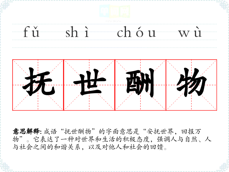 - 日常对话:用于表达对生活的感恩和回报之心,例如:“我们要抚世酬物,珍惜身边的一切。”