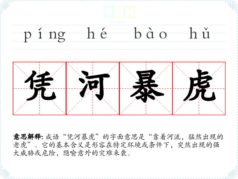 成语“凭河暴虎”的字面意思是“靠着河流,猛然出现的**”。它的基本含义是形容在特定环境或条件下,突然出现的强大威胁或危险,隐喻意外的灾难来袭。