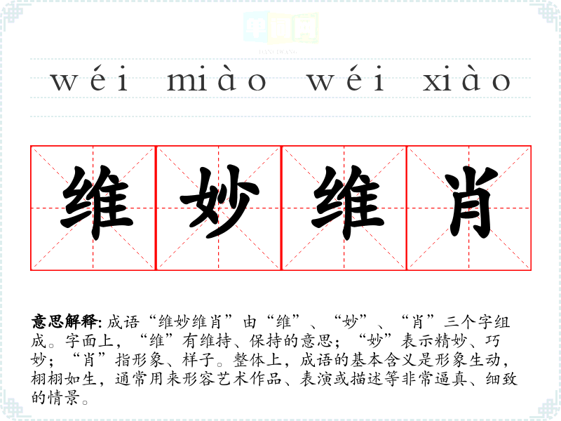 成语“维妙维肖”由“维”、“妙”、“肖”三个字组成。字面上,“维”有维持、保持的意思;“妙”表示精妙、巧妙;“肖”指形象、样子。整体上,成语的基本含义是形象生动,栩栩如生,通常用来形容艺术作品、表演或描述等非常逼真、细致的情景。