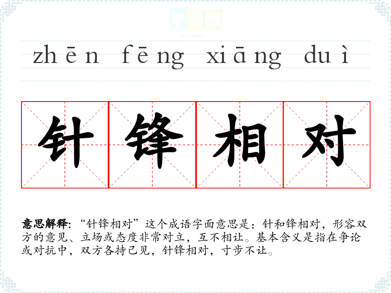 “针锋相对”这个成语字面意思是:针和锋相对,形容双方的意见、立场或态度非常对立,互不相让。基本含义是指在争论或对抗中,双方各持己见,针锋相对,寸步不让。