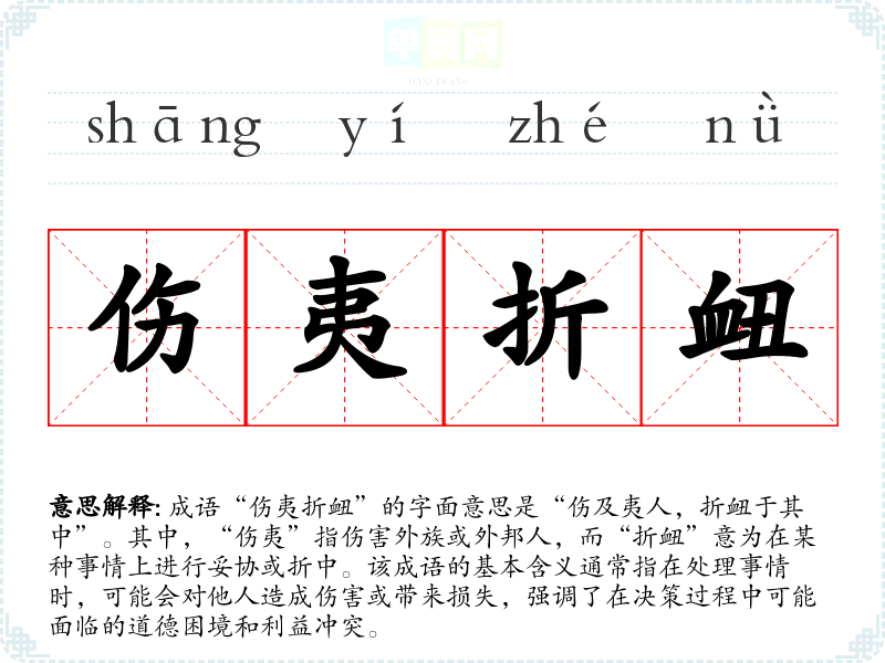成语“伤夷折衄”的字面意思是“伤及夷人,折衄于其中”。其中,“伤夷”指伤害外族或外邦人,而“折衄”意为在某种事情上进行妥协或折中。该成语的基本含义通常指在处理事情时,可能会对他人造成伤害或带来损失,强调了在决策过程中可能面临的道德困境和利益冲突。