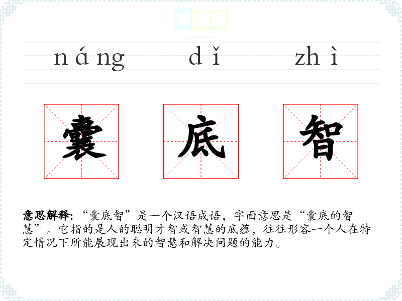 “囊底智”是一个汉语成语,字面意思是“囊底的智慧”。它指的是人的聪明才智或智慧的底蕴,往往形容一个人在特定情况下所能展现出来的智慧和解决问题的能力。