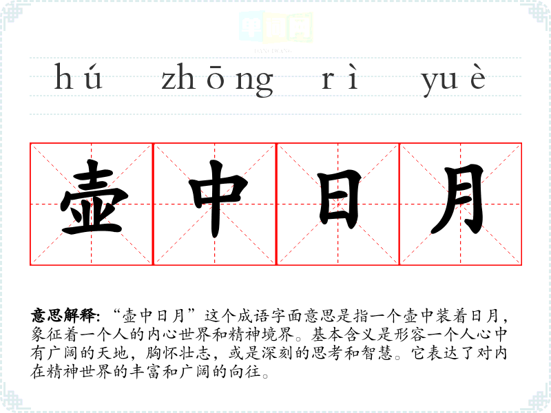 “壶中日月”这个成语字面意思是指一个壶中装着日月,象征着一个人的内心世界和精神境界。基本含义是形容一个人心中有广阔的天地,胸怀壮志,或是深刻的思考和智慧。它表达了对内在精神世界的丰富和广阔的向往。