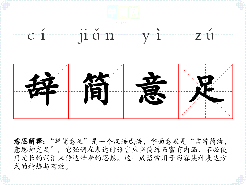 “辞简意足”是一个汉语成语,字面意思是“言辞简洁,意思却充足”。它强调在表达时语言应当简练而富有内涵,不必使用冗长的词汇来传达清晰的思想。这一成语常用于形容某种表达方式的精炼与有效。