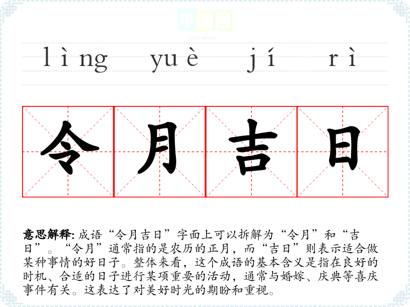 成语“令月吉日”字面上可以拆解为“令月”和“吉日”。“令月”通常指的是农历的正月,而“吉日”则表示适合做某种事情的好日子。整体来看,这个成语的基本含义是指在良好的时机、合适的日子进行某项重要的活动,通常与婚嫁、庆典等喜庆**有关。这表达了对美好时光的期盼和重视。