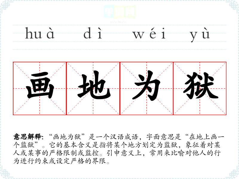 | 画地为牢 | 在地上画一个圈当做监狱。比喻只许在指定的范围内活动。 |
