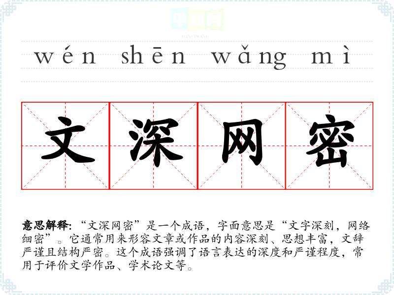 “文深网密”是一个成语,字面意思是“文字深刻,网络细密”。它通常用来形容文章或作品的内容深刻、思想丰富,文辞严谨且结构严密。这个成语强调了语言表达的深度和严谨程度,常用于评价文学作品、学术论文等。